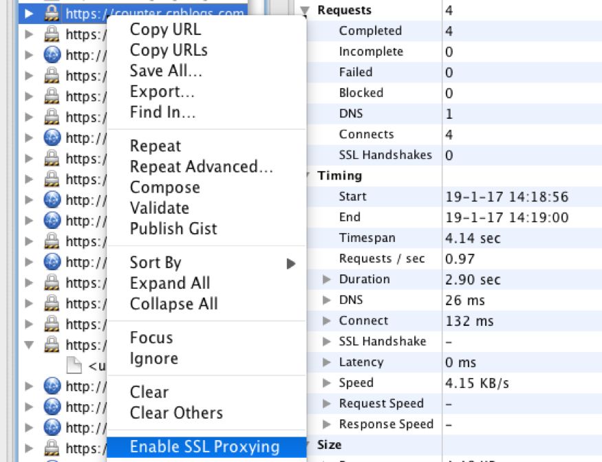也可以在抓包界面,右键点击某条/组请求,在弹出的选项列表中点击Enable SSL Proxying启用权限。图示如下: