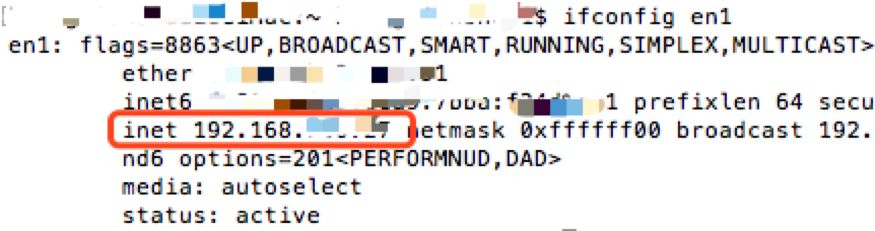 也可以在Mac终端使用命令ifconfig en1查看PC的IP地址。图示如下: