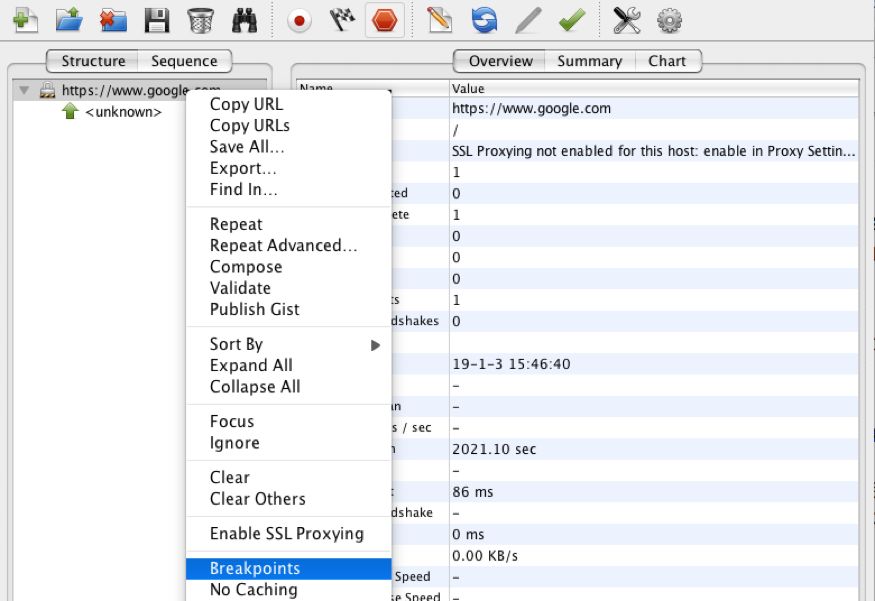 在Charles的请求预览界面中,右键点击某条/组请求,在弹出的选项列表中有Breakpoints选项。图示如下: