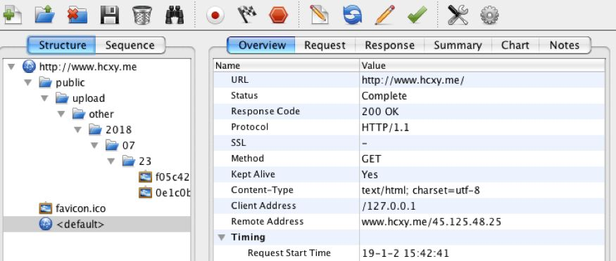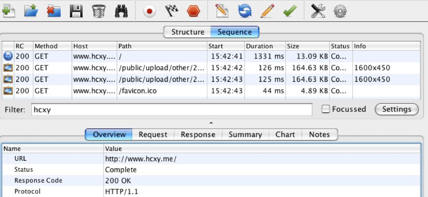 Charles提供了Structure和Sequence两种预览模式。 Structure以域名对请求进行分组,可以很方便地预览同一域名下的请求数据,也方便于日常开发中对某一服务接口的分析和处理。图示如下: