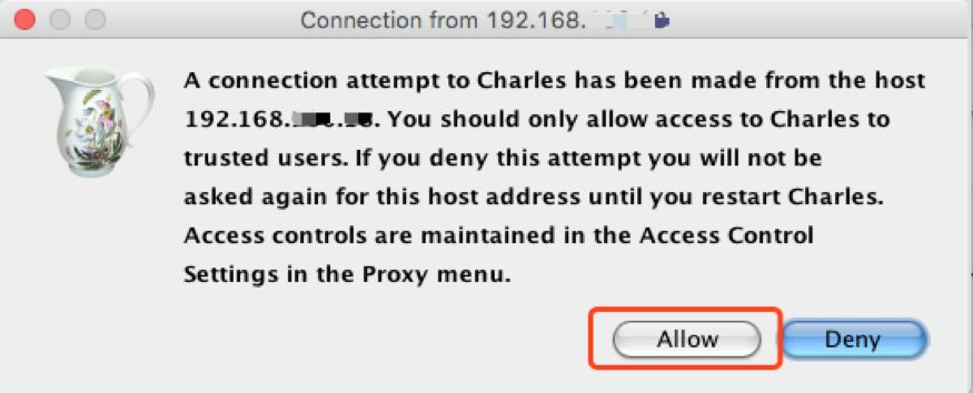 iPhone代理配置完成后,Charles会弹出连接提示框,点击Allow之后即可使用Charles对从该iPhone发出的请求进行抓包了。图示如下: