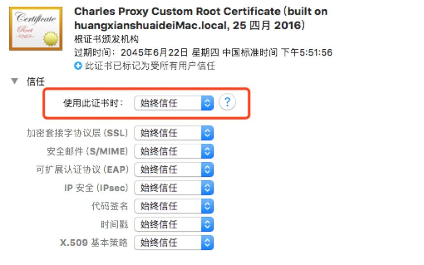 证书可以在Mac的钥匙串中查看,双击证书,将信任权限设定为始终信任。图示如下:
