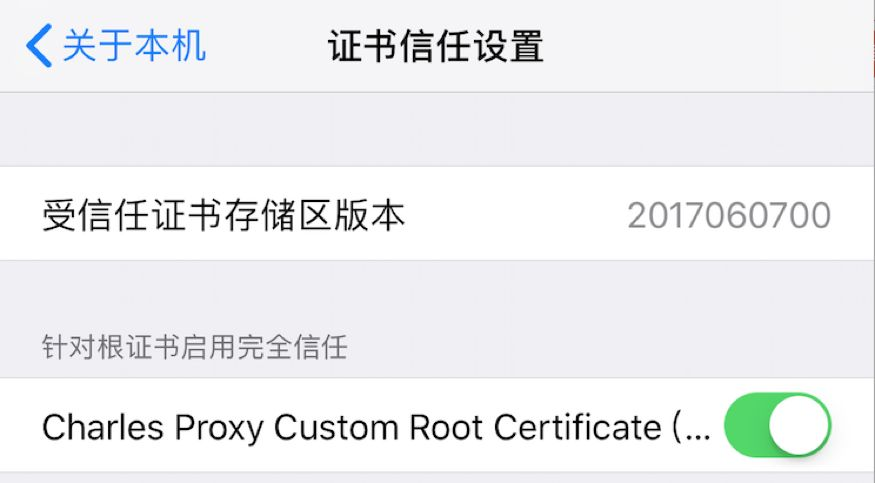 基于iOS的证书信任机制,在安装完成并信任证书后,需要到iPhone设置 -> 关于本机 -> 证书信任设置 中启用根证书。图示如下: