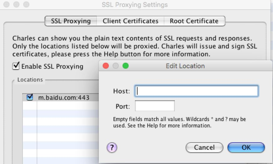 在Charles菜单栏 -> Proxy -> SSL Proxying Settings中勾选Enable SSL Proxying ,然后在Locations中添加需要抓包的Host和Port即可。图示如下: