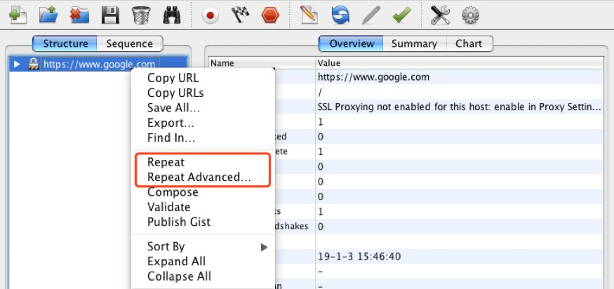 在Charles的请求预览界面中,右键点击某条/组请求,在弹出的选项列表中有Repeat和Advanced Repeat 两个选项。图示如下:
