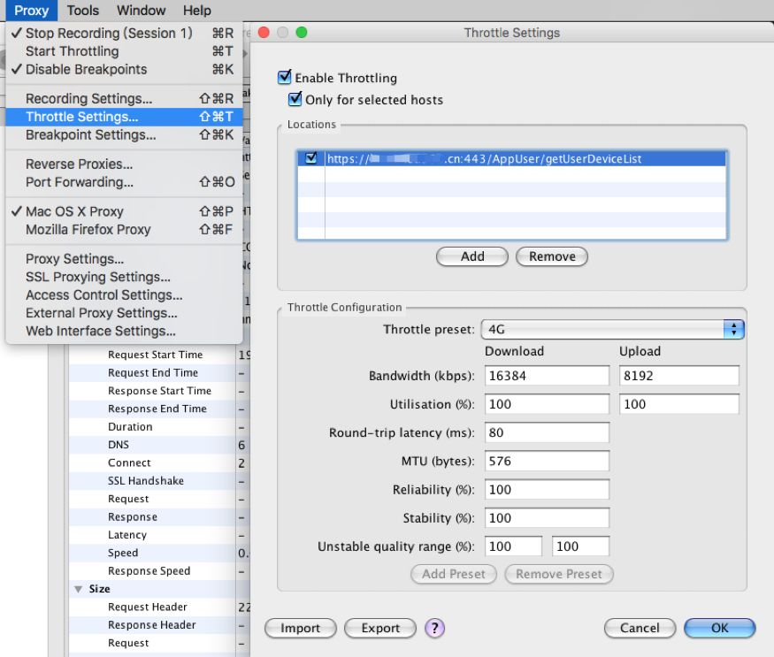 在Charles菜单栏 -> Proxy -> Throttle Settings中可以启用Throttling (节流)功能,并自定义Locations(受限服务接口)和Throttle Configuration (节流配置)。支持对Throttle preset(预置的数据传输方式)、Bandwidth (带宽) Utilisation(利用比率)、 Round-trip latency (往返延迟)、MTU(最大传输单元) Reliability (可靠性) Stability(稳定性)等参数进行编辑。其中,在Throttle preset 支持模拟3G/4G网络环境。图示如下: