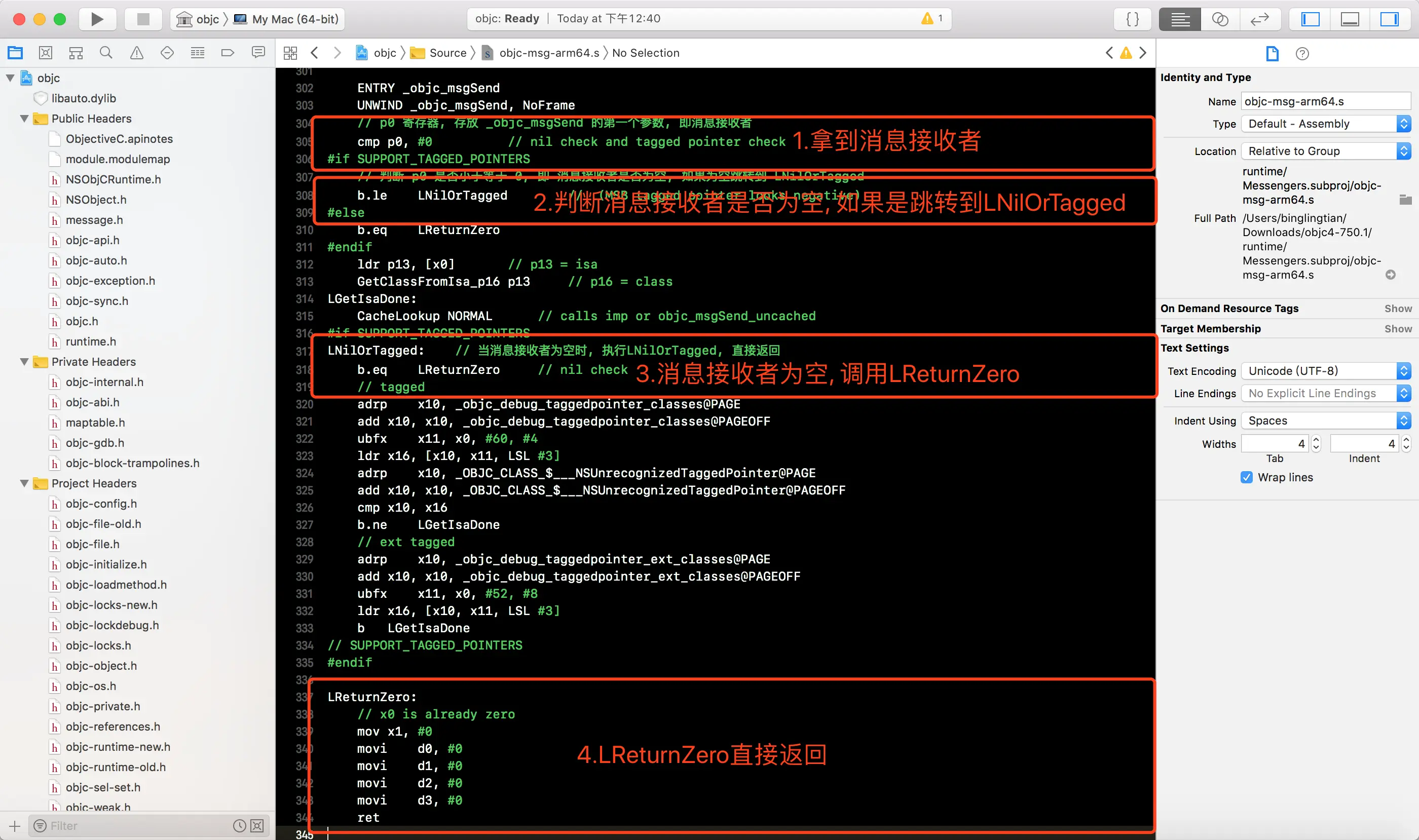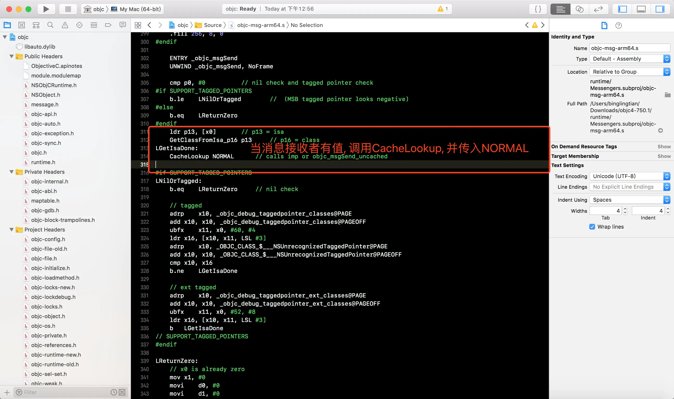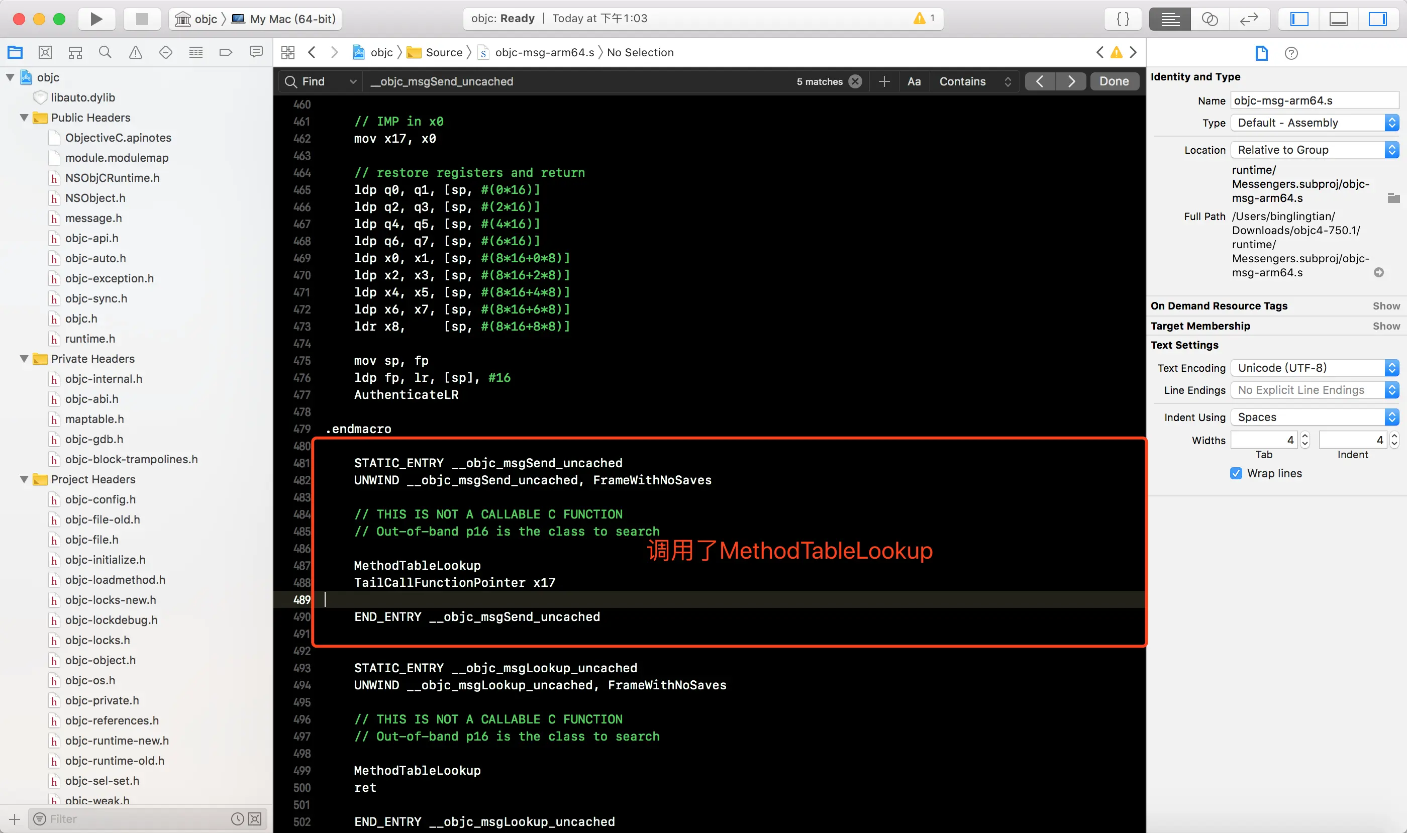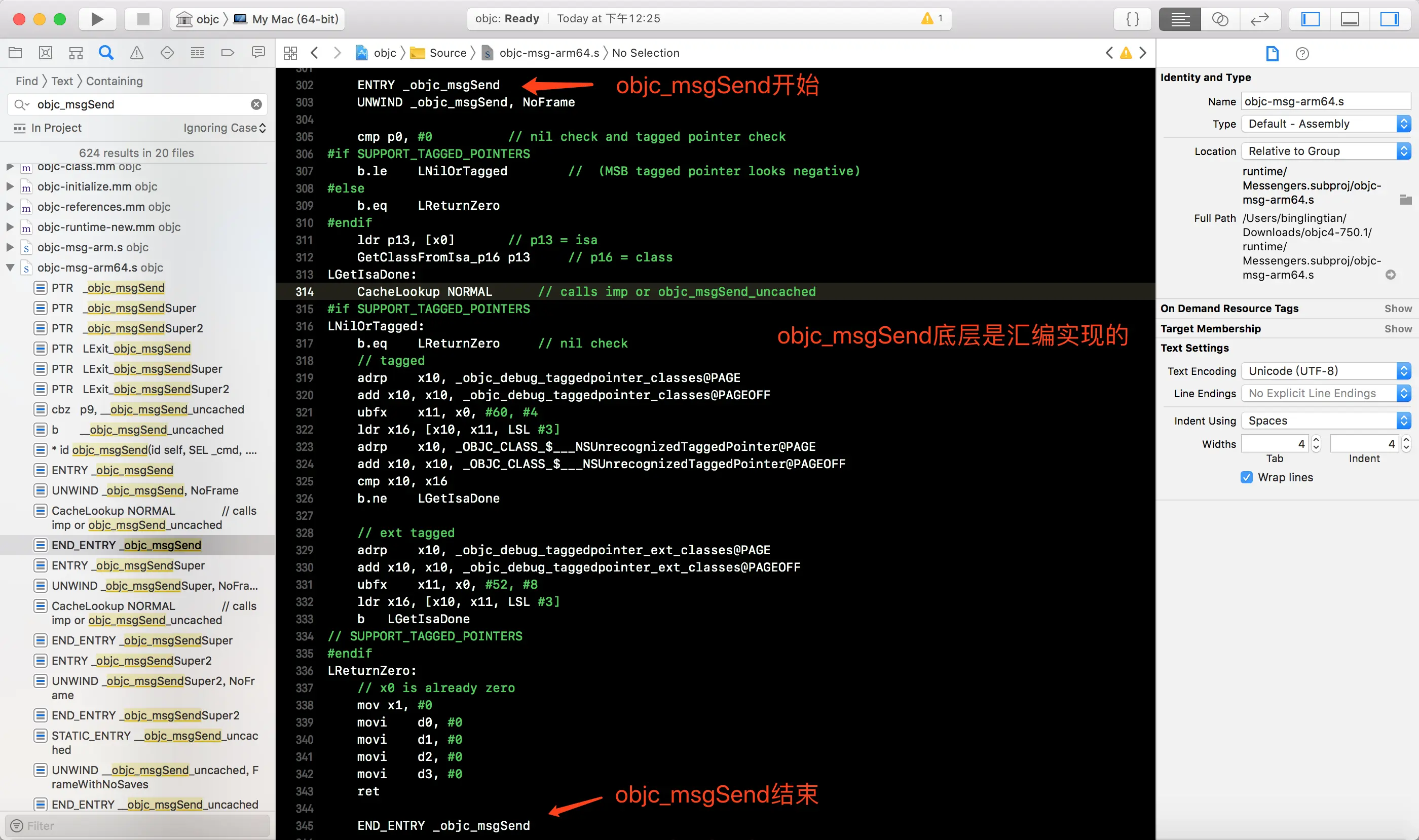 objc_msgSend的底层实现, 可以看到objc_msgSend底层是由汇编实现的