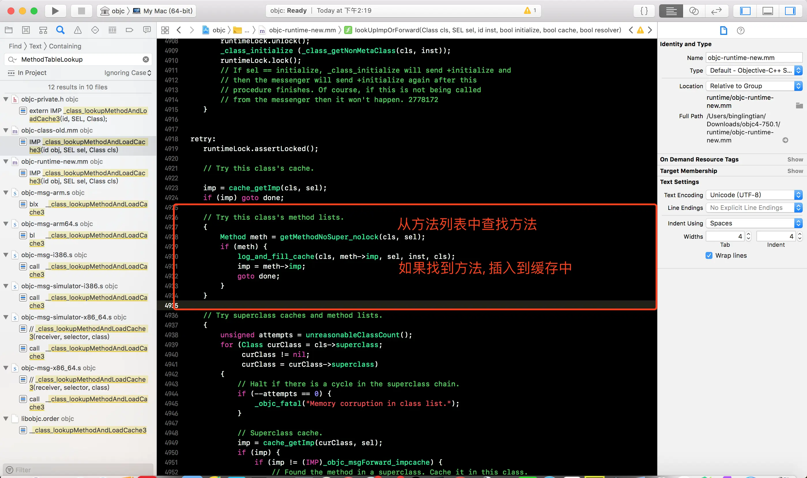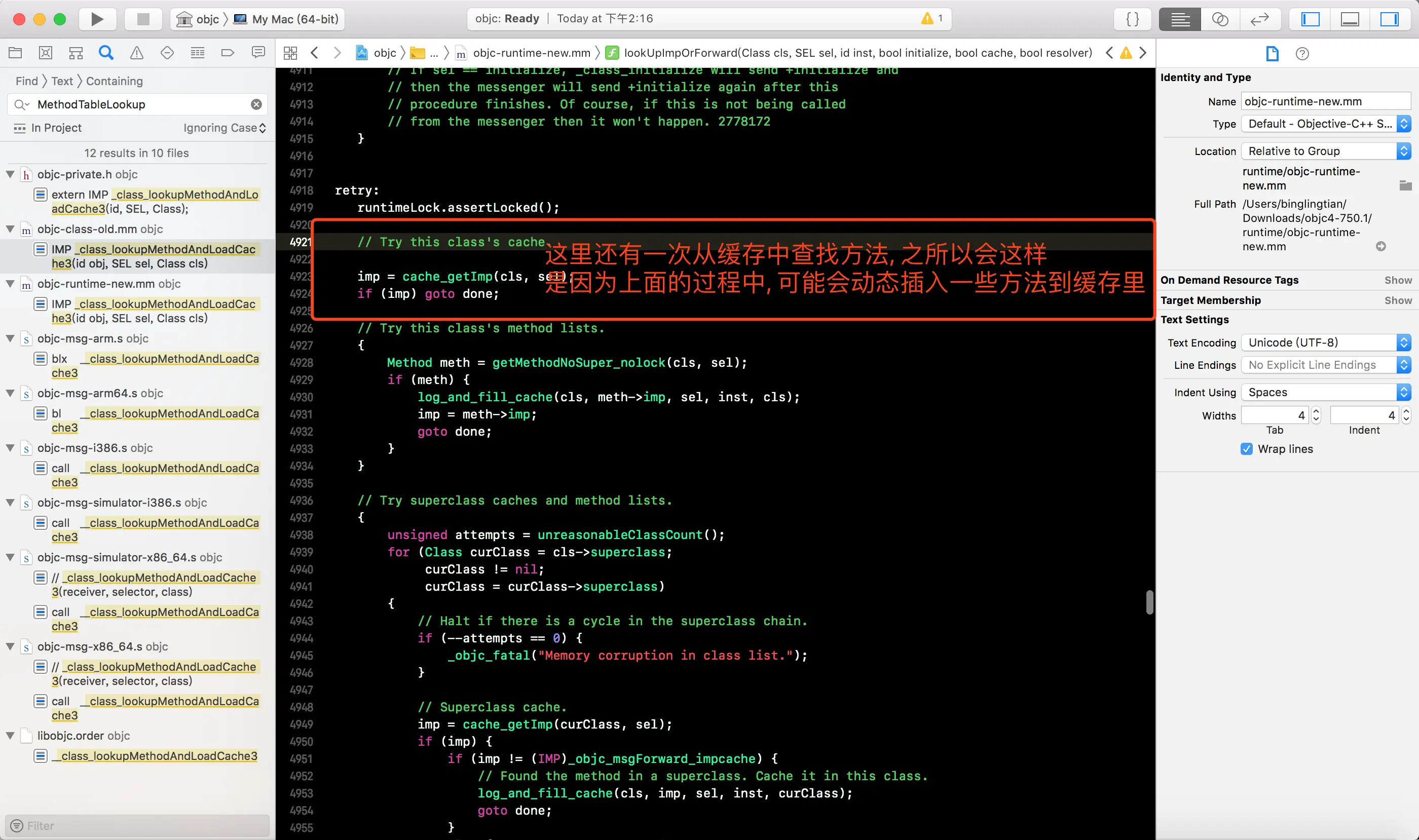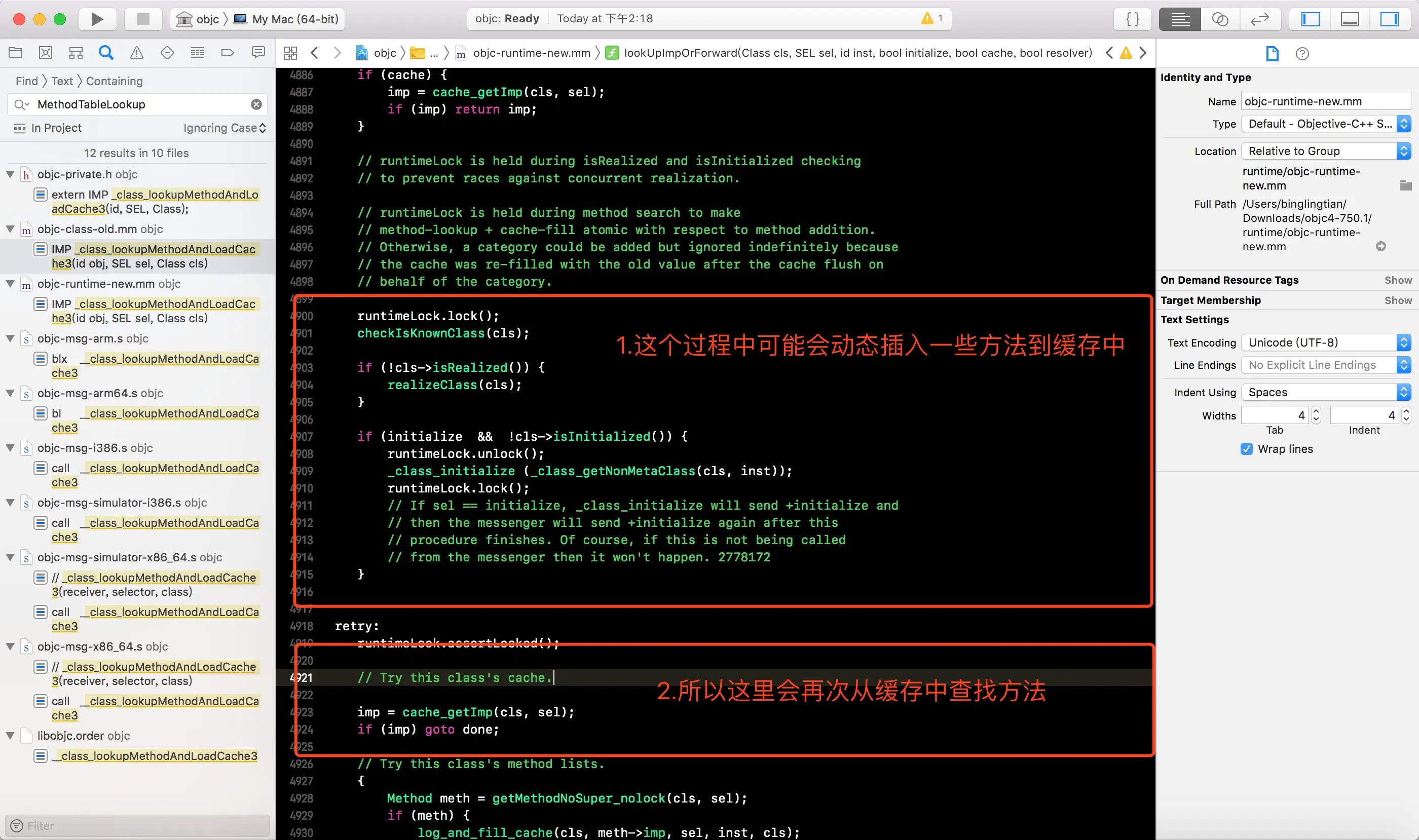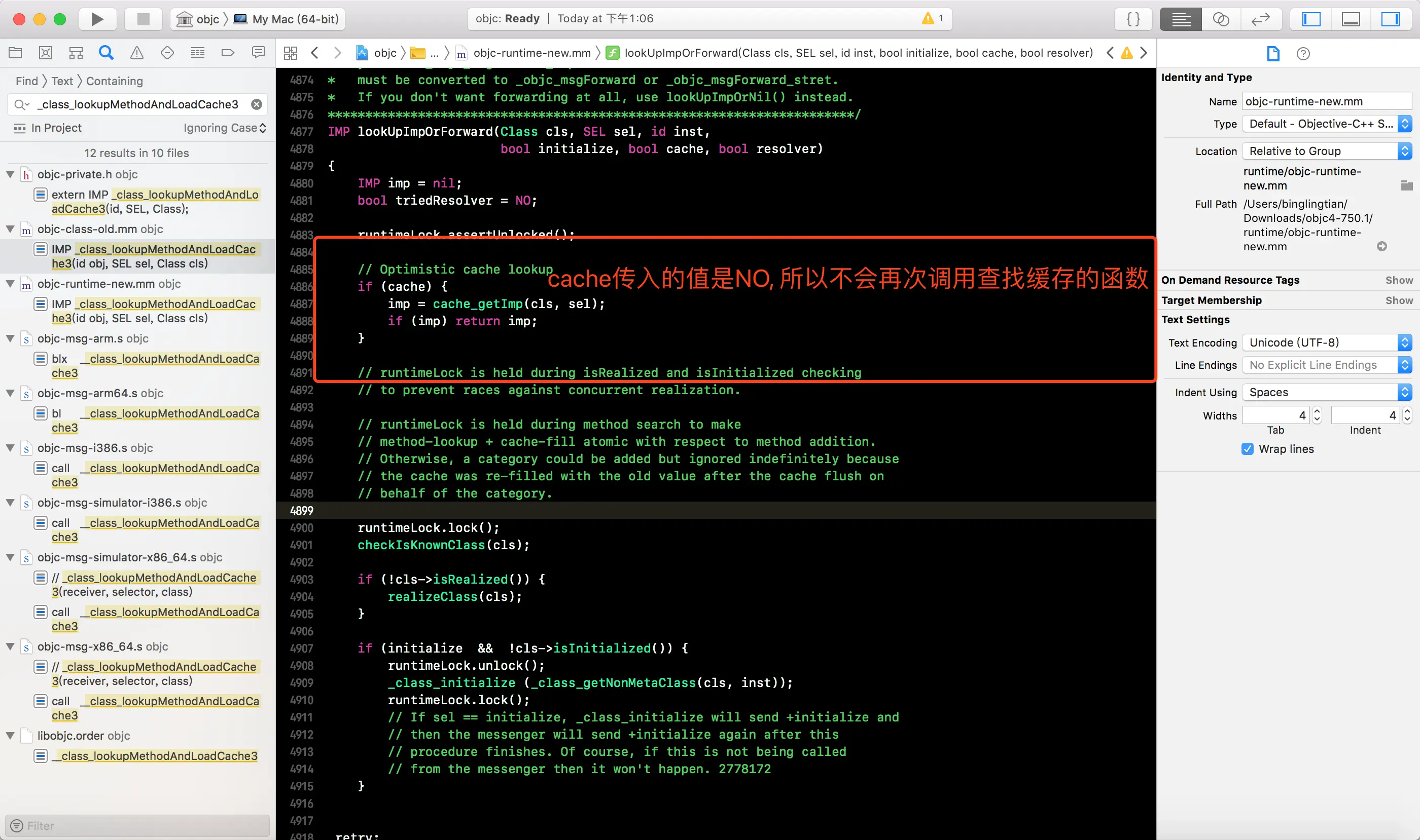 lookUpImpOrForward函数, 可以看到当传入cache为YES时, 会查找缓存中的方法