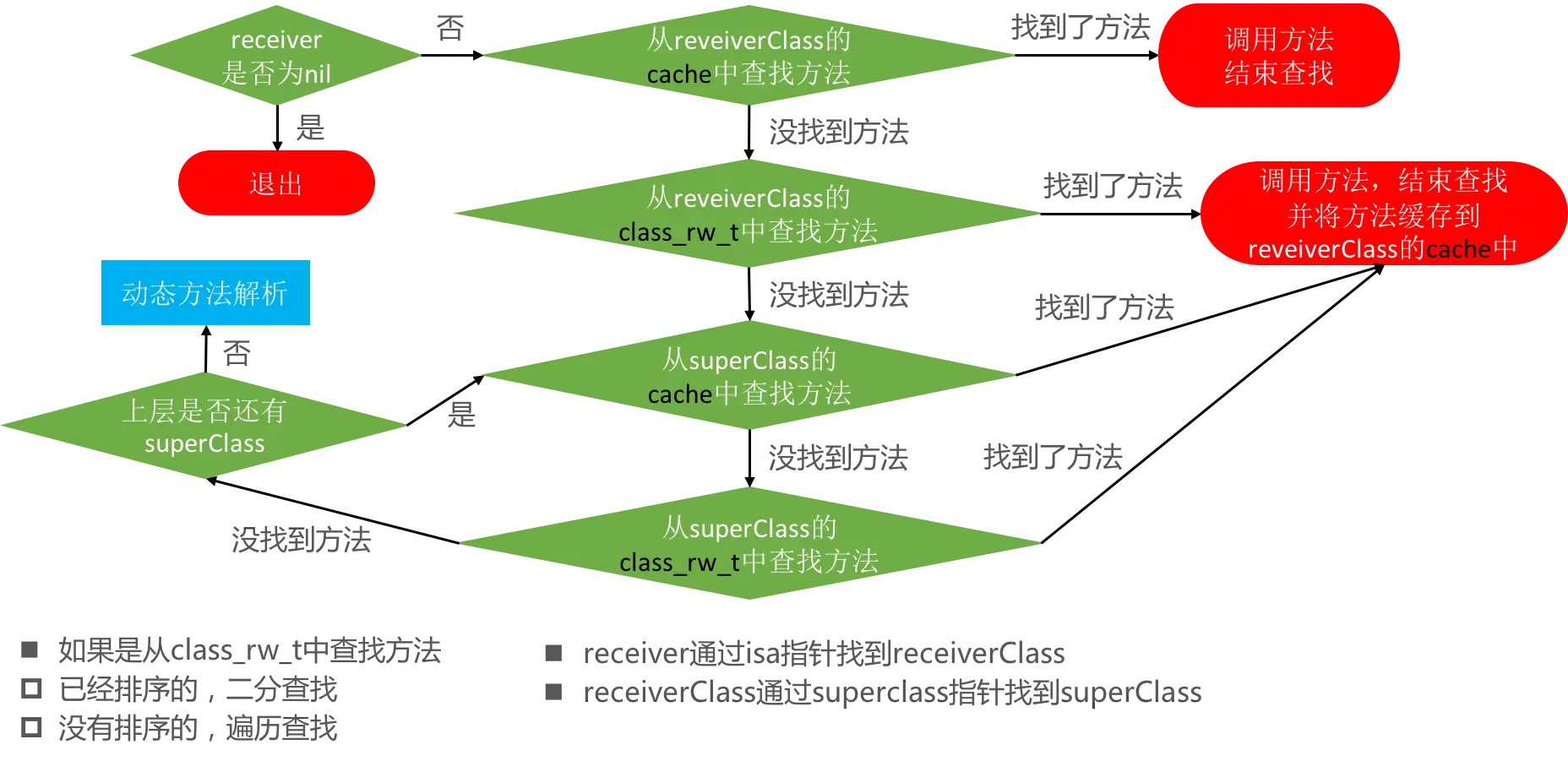 - 当缓存中没有找到需要调用的方法时, 就会在方法列表中查找, 如果找到就会存到缓存