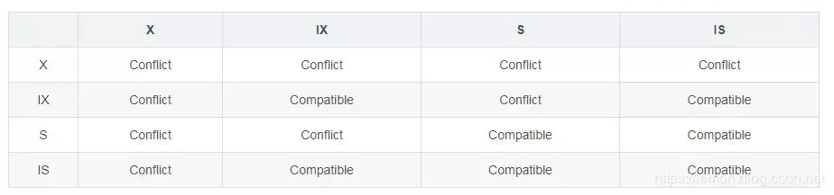 前文说了,意向锁实现的背景是多粒度锁的并存场景。如下兼容性的汇总: