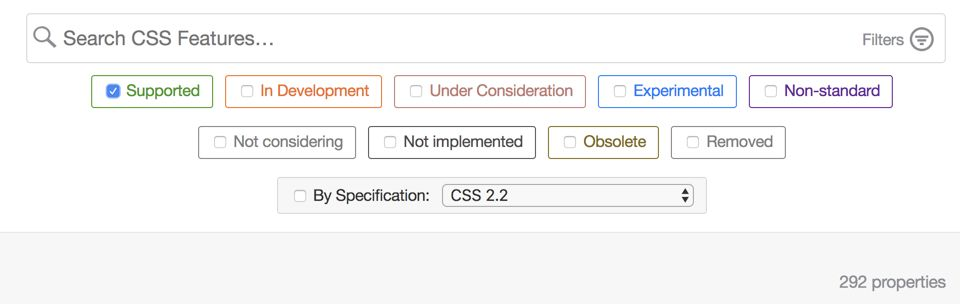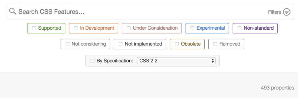 这个页面只是 webkit 中的一些 CSS 的一些现状,其中包含已经支持的、未支持的、实验性中的等等各种状态,通过筛选看看那个数量,感觉真的是挺可怕的。