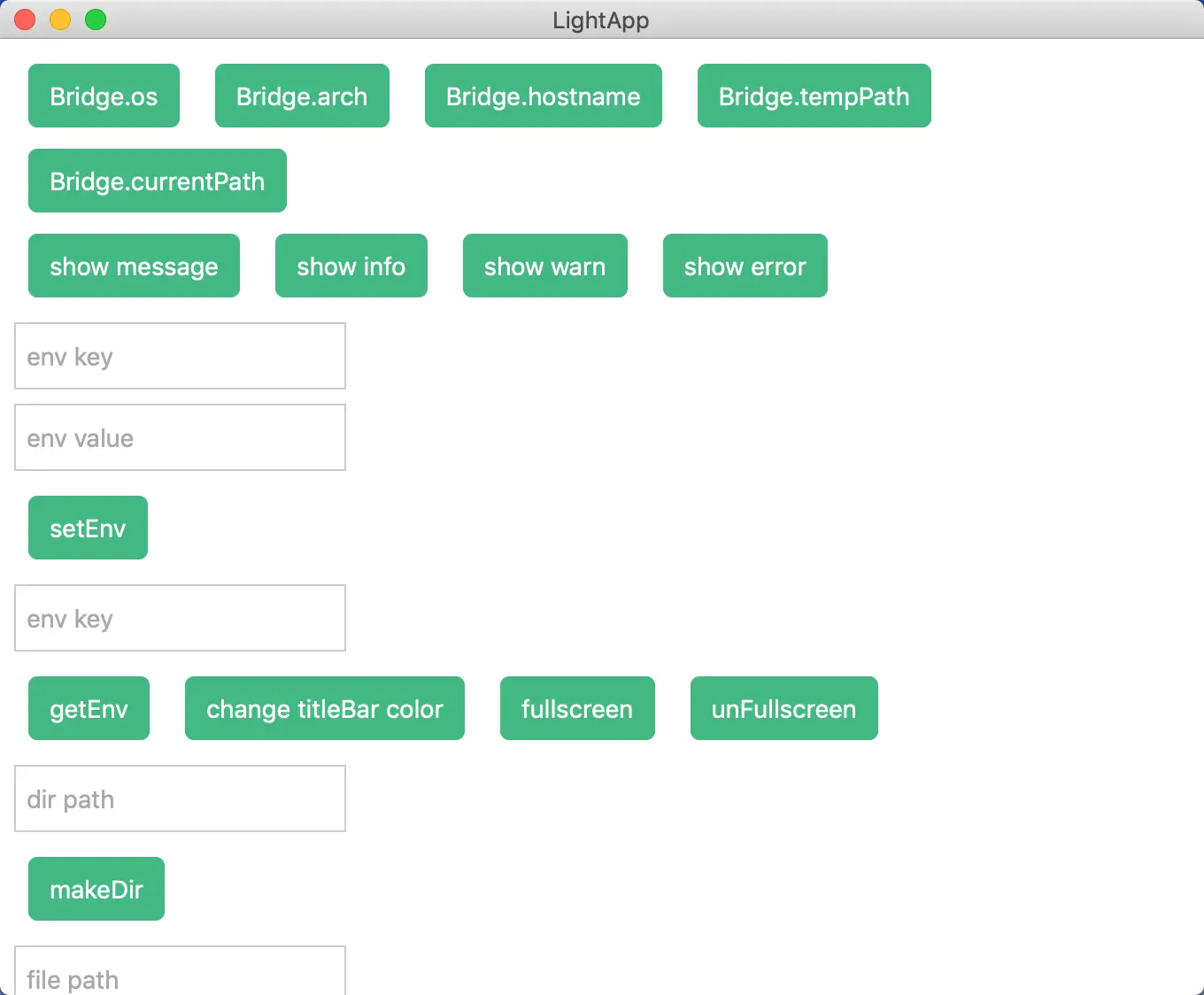 Bridge.init(): 初始化Bridge,调用这个方法之后,Bridge的属性生效。Bridge.exit(): 退出程序Bridge.message(title, content): 消息弹窗Bridge.info(title, content): 信息弹窗Bridge.warn(title, content): 警告弹窗Bridge.error(title, content): 错误弹窗Bridge.setEnv(key, value): 设置环境变量Bridge.setColor(r, g, b, a): 设置标题栏颜色Bridge.setFullScreen(bool): 设置是否全屏有返回值