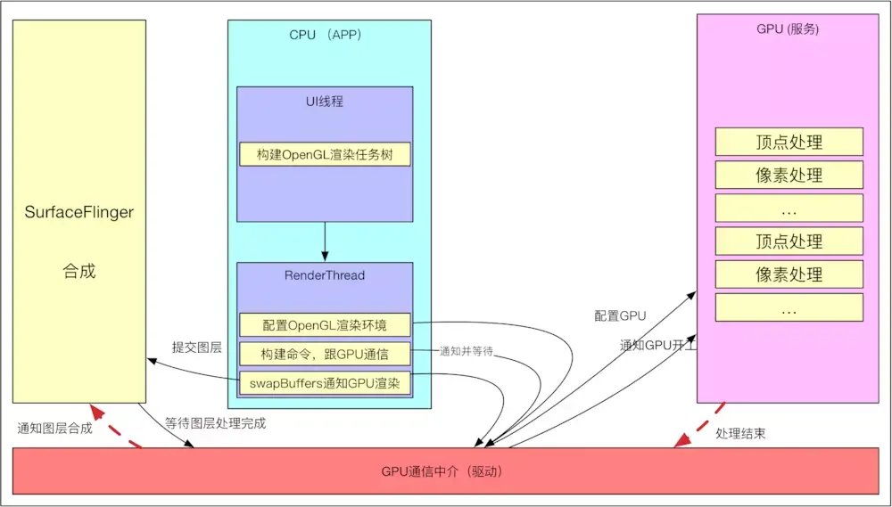渲染工作的真正执行者是 GPU,而 GPU 对于动画一无所知:执行动画的唯一途径便是将每一帧的不同绘制操作分发给 GPU,但该逻辑本身不能在 GPU 上执行。而如果在 UI 线程执行该操作,任意的重操作都将阻塞新的绘制指令及时分发,于是动画便出现了延迟。