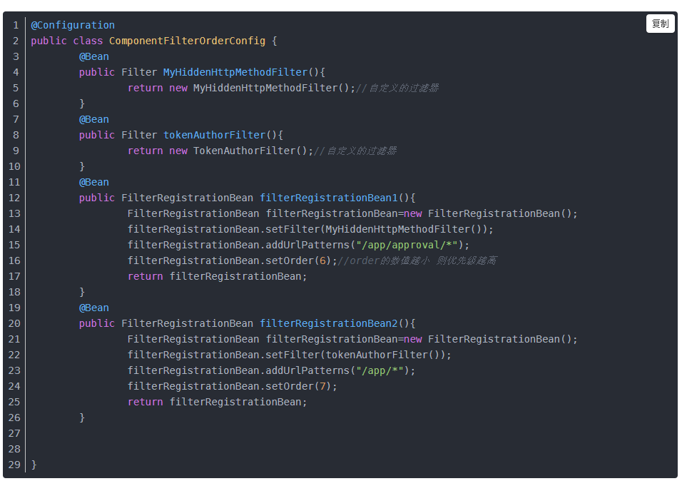 先生成一个过滤器的bean,再把过滤器的bean注入到FilterRegistrationBean中,并设置一些属性,过滤的url,执行的顺序之类的(order的数值越小,优先级越高)即可。