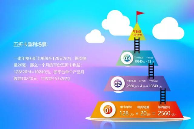 收益场景:一张年费五折卡单价在128元左右,每周每周卖出20张,那么一个月的平台五折卡收益:128*20*4=10240元,即平台单个产品月收益10240元,年收益在15万左右。