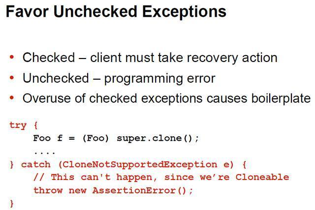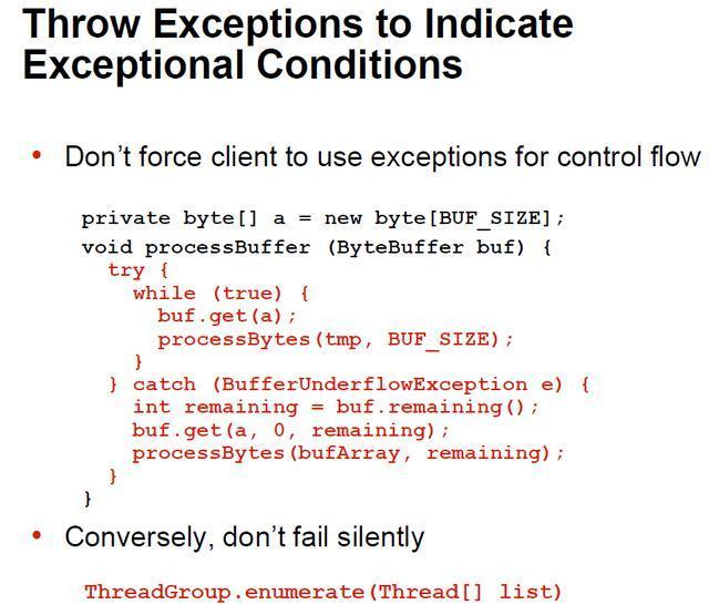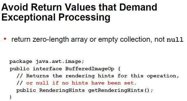 尽量返回不需要调用者进行异常处理的参数,比如空数组或集合,而不是null