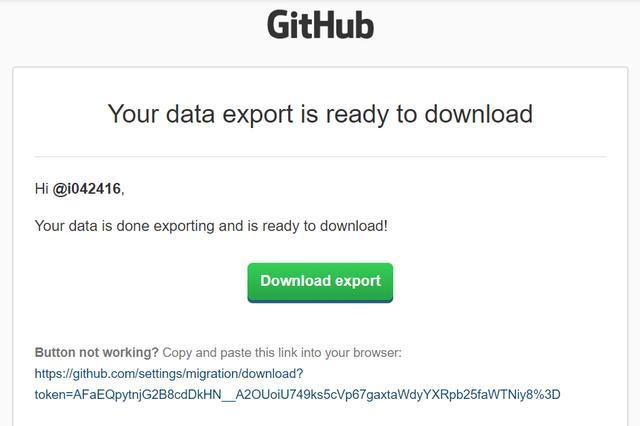 过了一会,我们github注册的邮箱地址会收到一封邮件,点击Download export就可以下载一个压缩包到本地: