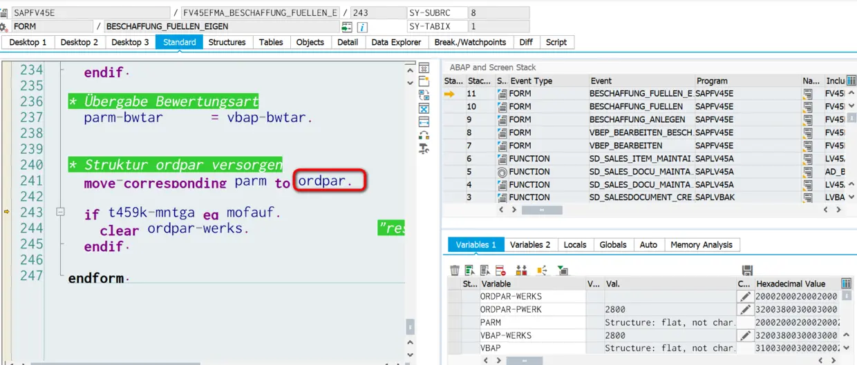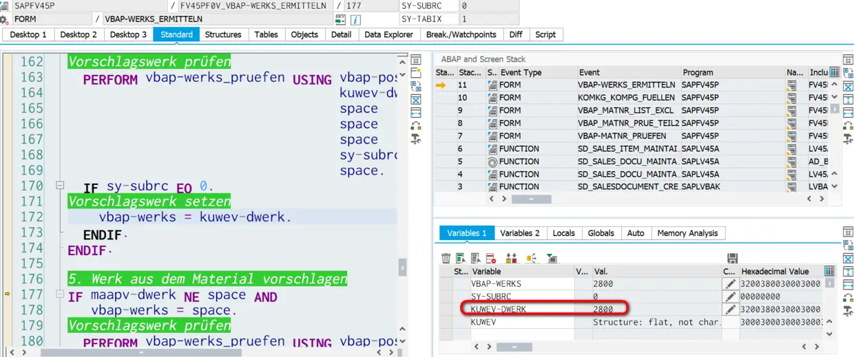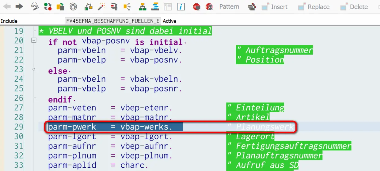 通过阅读SAP S/4HANA有关生产订单的标准代码发现,生产订单使用的plant工厂数据来自表VBAP的字段WERKS。