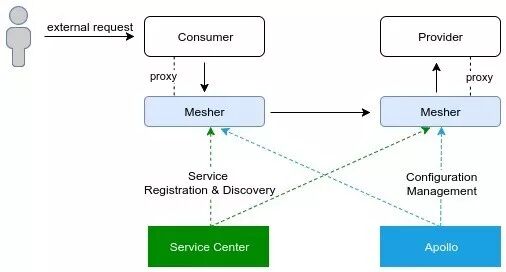 Mesher脱胎于go-chassis,一个go语言的微服务SDK,提供了路由、负载均衡、容错熔断、限流等微服务治理核心能力,Mesher直接在代码层面引用go-chassis的核心能力,并在此基础上构建了作为网络代理的功能。Mesher的架构中,一些关键功能都做了接口定义和插件化的实现,包括控制面的服务发现、配置管理。当前Mesher的控制面可以接入Apache ServiceComb的服务发现组件Service Center,而配置管理则支持多种配置形式,包括文件、环境变量和命令行等。此外,由于插件化的设计,Mesher也实现了对开源配置管理中心Apollo的支持。目前的最佳实践如下图所示: