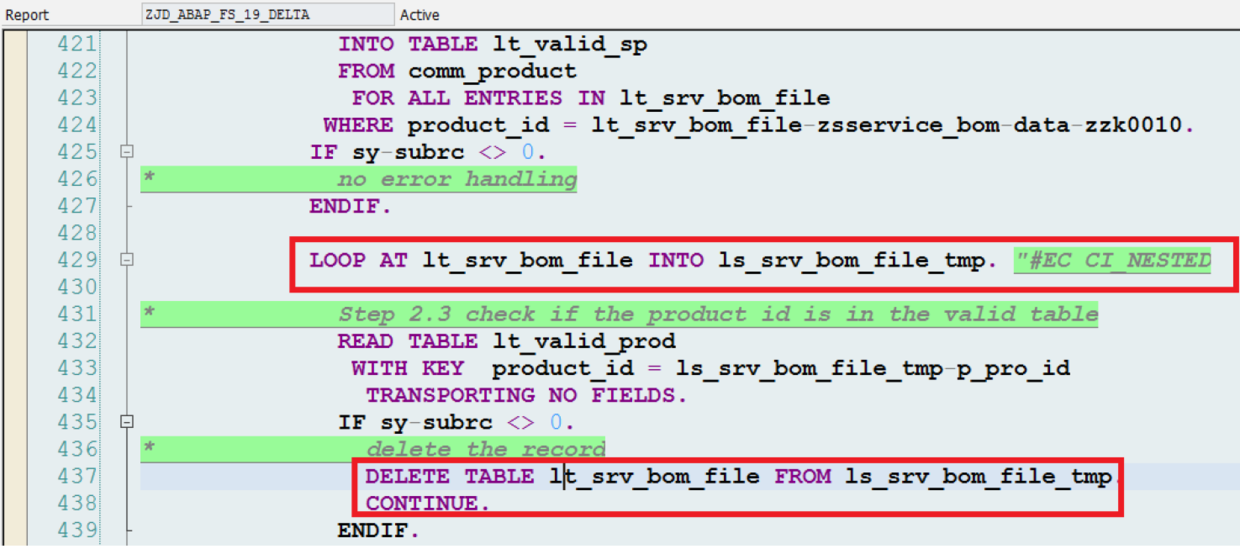 Loop at all service BOM, check whether the ID in current loop does exist in validation table lt_valid_prod or lt_valid_sp. If so, delete them via DELETE TABLE XXX FROM .