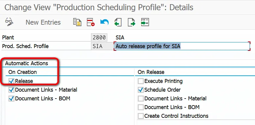 如下图所示:Automatic Actions标签页里的On Creation->Release勾选中,意思就是Production Order创建后自动释放。