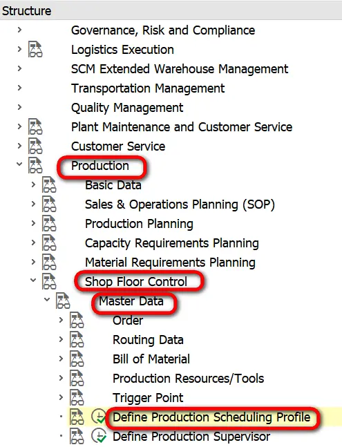 这个scheduling profile的配置在路径Production->Shop Floor Control->Master Data->Define Production Scheduling Profile里: