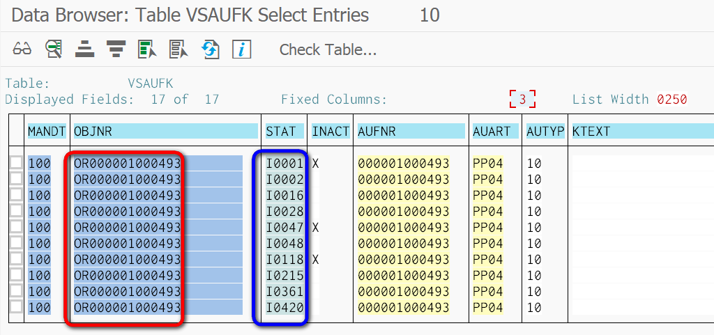 生产订单的ID和状态ID的关系是1:N,维护在数据库表VSAUFK里: