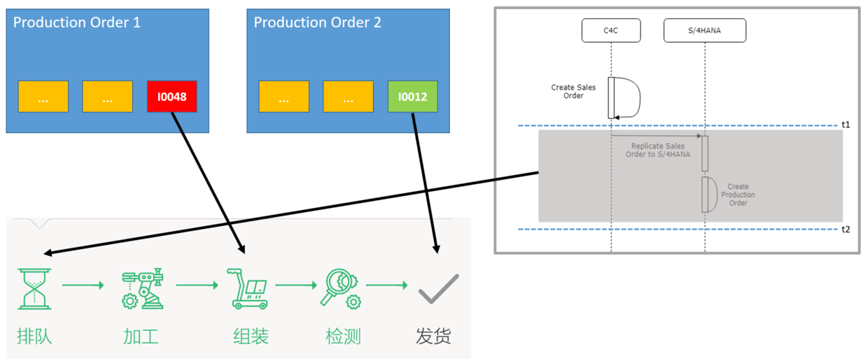 如果C4C创建的销售订单还未同步到S/4HANA,或者虽然同步到S/4HANA,但是S/4HANA的生产订单尚未创建完成,即下图右边灰色区域的时间窗口所示,此时如果查询生产订单状态,API会返回状态排队中.