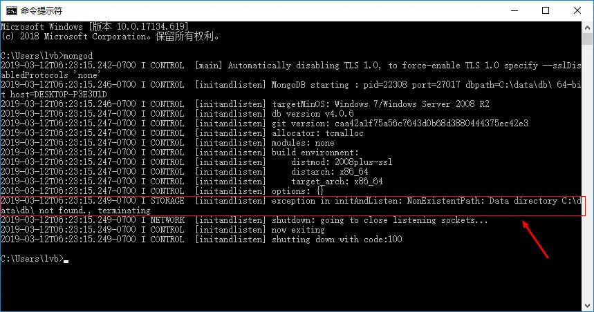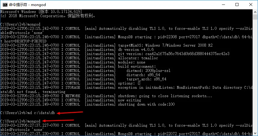 cmd命令工具,运行命令mongod,提示c:\data\db\路径不存在。