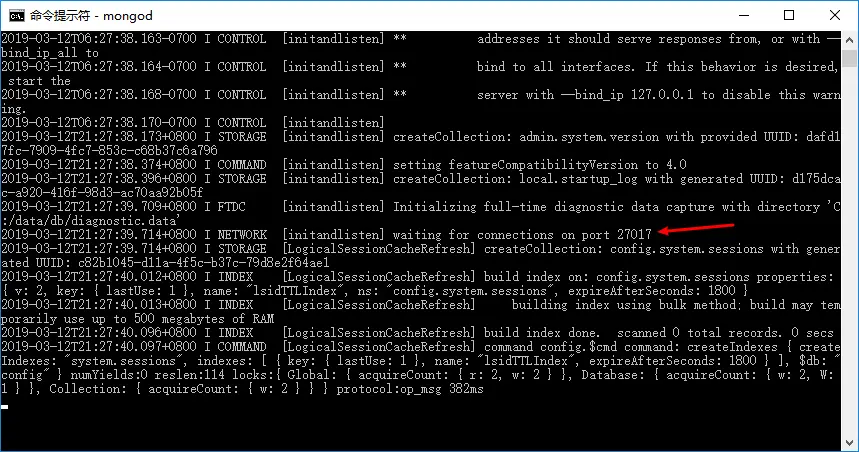 MongoDB是把数据保存到这里的,所以我们这里自己创建这个文件夹。并重新执行命令mongod,可以看到没有出现异常,并且显示正在监听端口27017。
