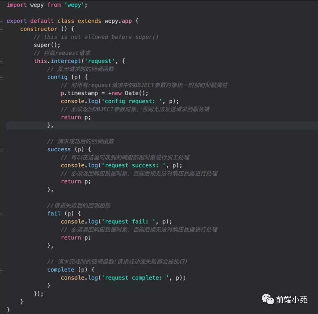 wepy对wx.request做了接受参数的修改,值得一提的是它提供了针对全局的intercapter拦截器。
