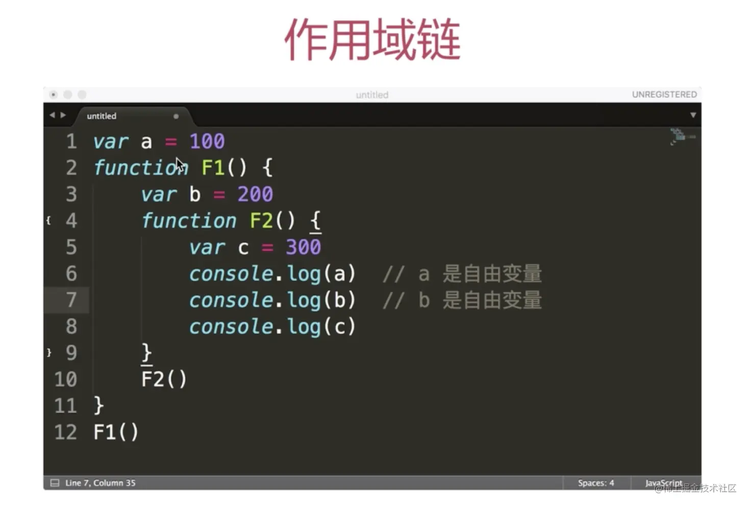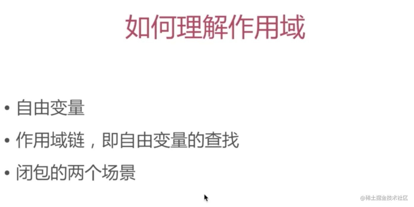 作用域链 函数在寻找自由变量的作用域时是 函数定义时 的父级作用域,当函数内没有时会去父级作用域去找,找到了就停止寻找,如果还没有,继续向上找,不能访问子函数作用域里面的值