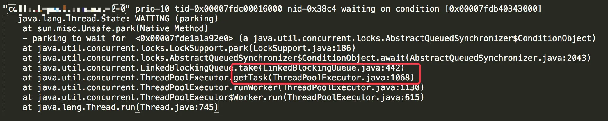 细心的朋友会发现正常运行的线程名称和异常后处于 waiting 状态的线程名称是不一样的,这个后续分析。
