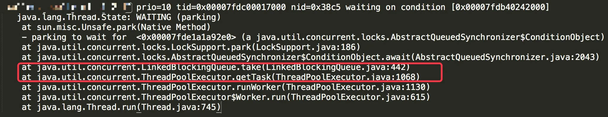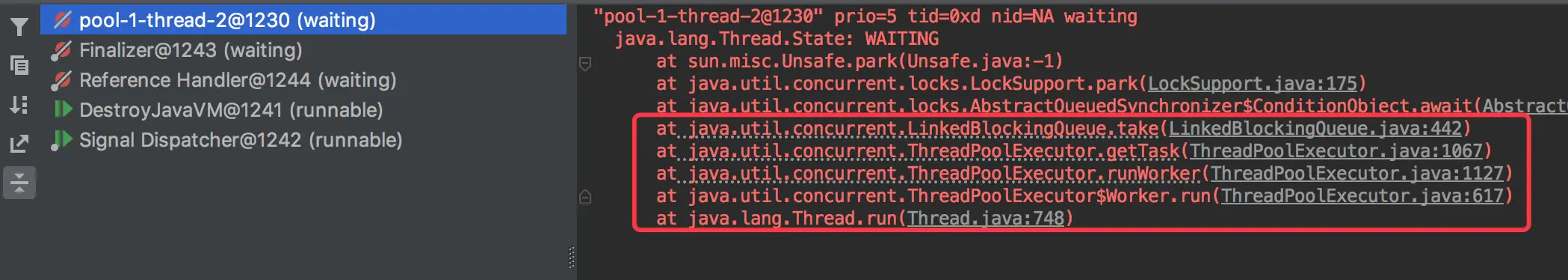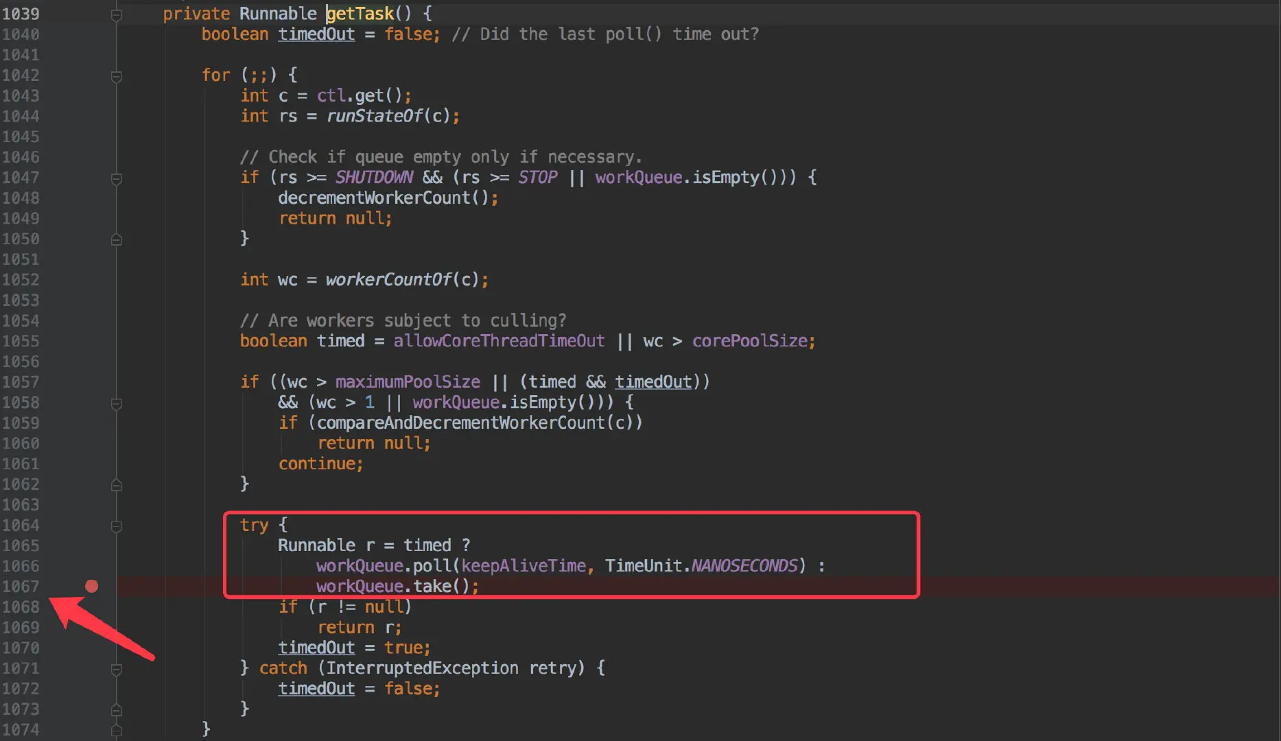 而一旦队列是空的,它就会 waiting 在 workQueue.take(),也就是我们从堆栈中发现的 1067 行代码。