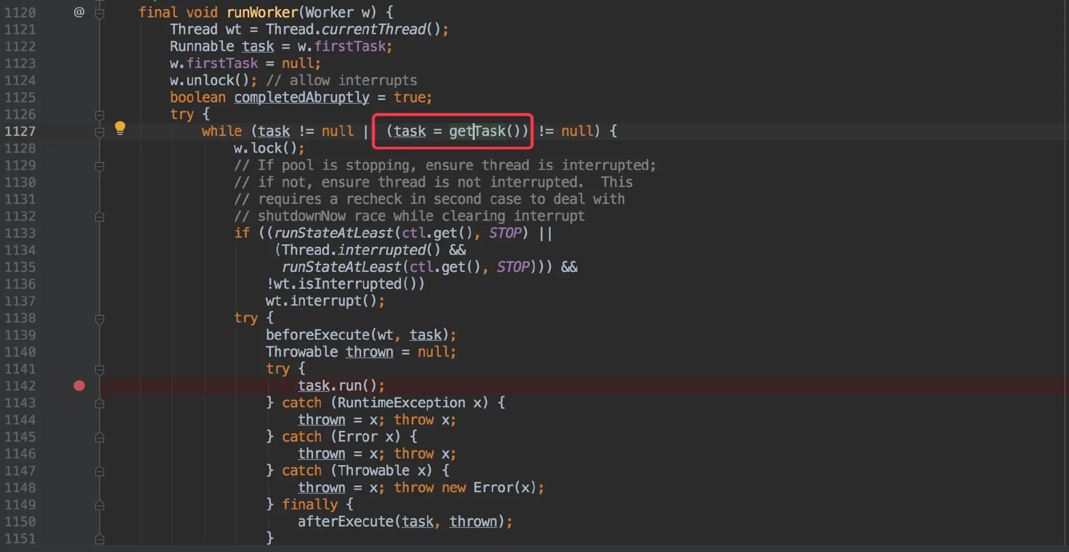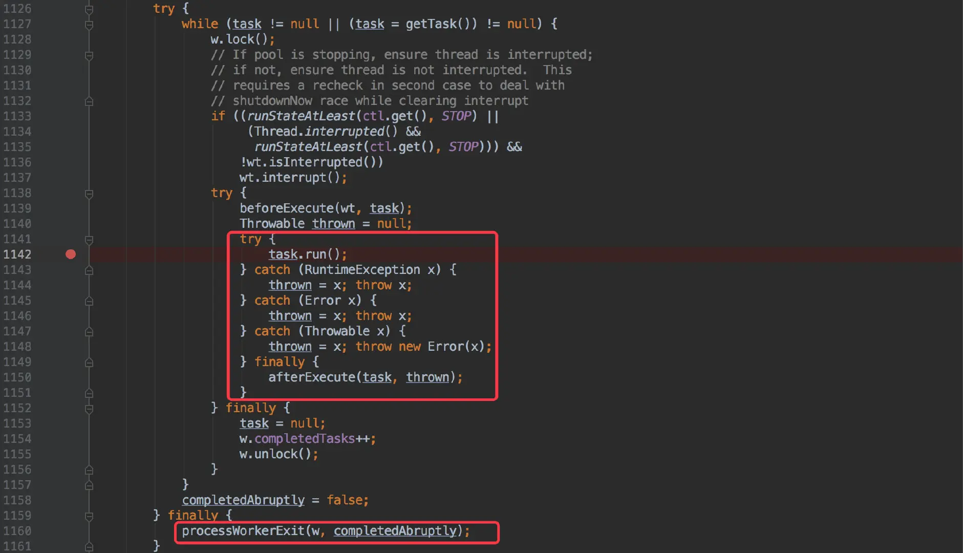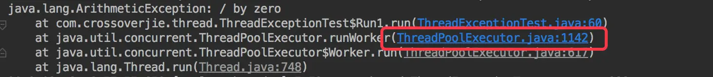 通过刚才的异常堆栈我们进入到 ThreadPoolExecutor.java:1142 处。