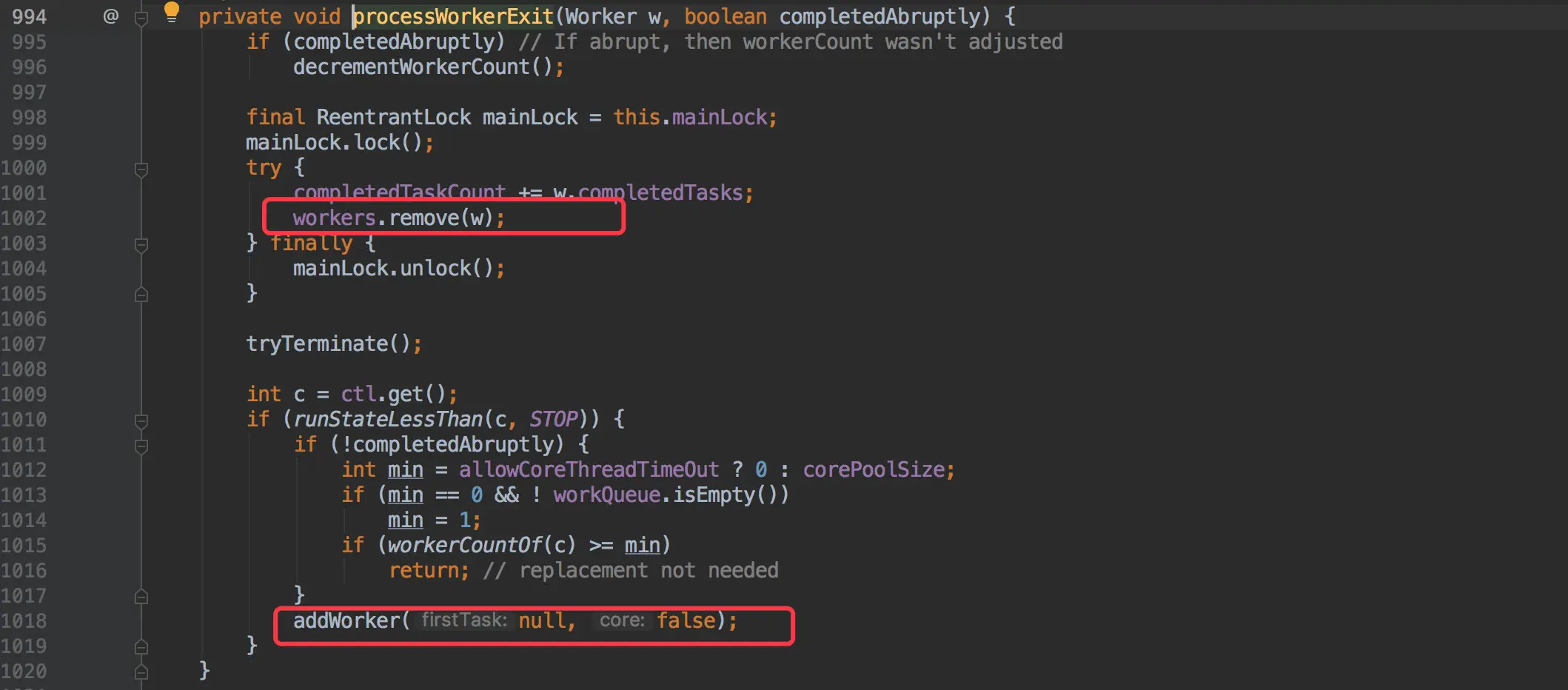 processWorkerExit 可以简单的理解为是把当前运行的线程销毁(workers.remove(w))、同时新增(addWorker())一个 Worker 对象接着处理;