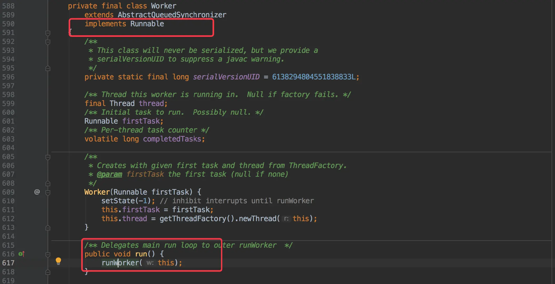 由于 Worker 实现了 Runnable 接口,所以本质上就是调用了 runWorker() 方法。