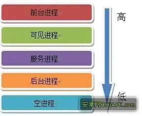 Android 基于进程中运行的组件及其状态规定了默认的五个回收优先级: