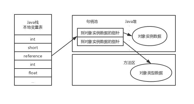 如果使用句柄访问的话,那么Java堆中将会划分出来一块内存作为句柄池,reference中存储的就是对象的句柄地址,而句柄中包含了对象实例数据与类型数据各自的具体地址信息。如下图所示。