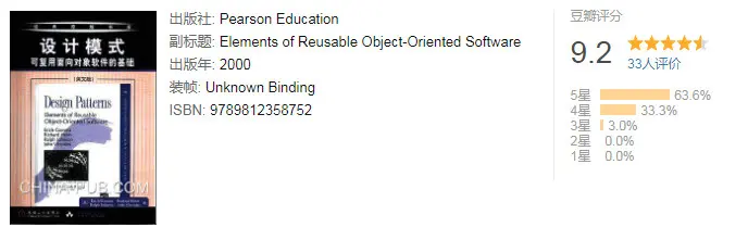 在 1994 年,由 Erich Gamma、Richard Helm、Ralph Johnson 和 John Vlissides 四人(这四位作者在软件开发领域里以“四人帮”(英語,Gang of Four,简称GoF)而闻名)合著出版了一本名为 Design Patterns - Elements of Reusable Object-Oriented Software(中文译名:设计模式 - 可复用的面向对象软件元素) 的书,首次提到了软件开发中设计模式的概念。书中所提到的,总共有 23 种设计模式。