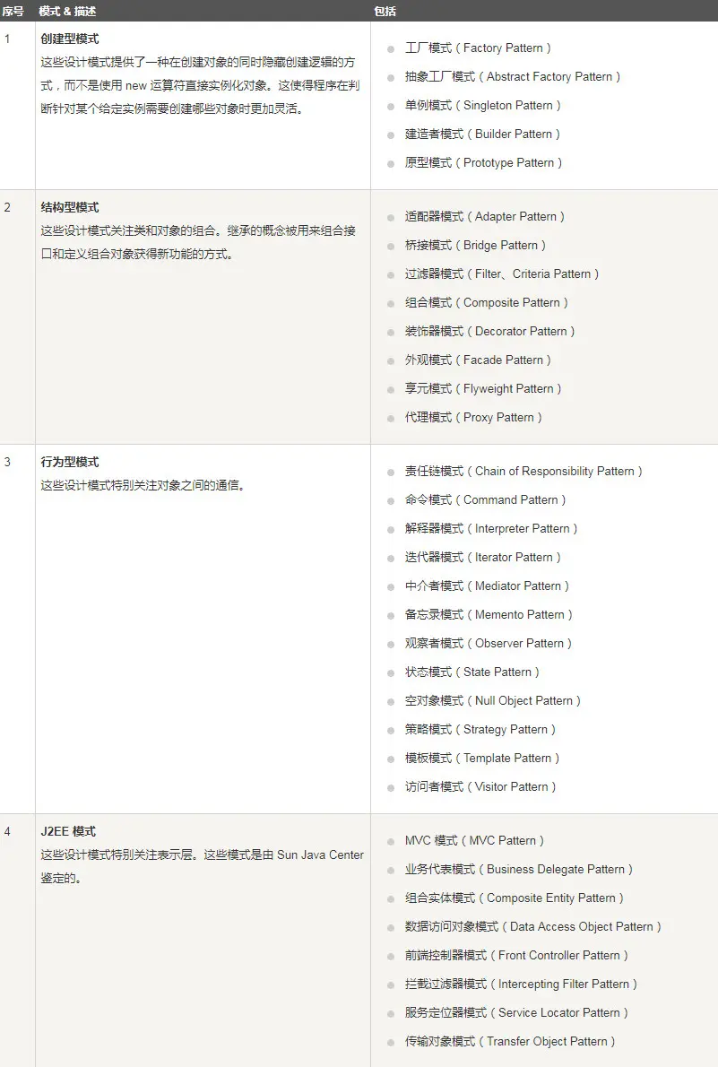 行为型模式(Behavioral Patterns)(11种):策略模式、模板方法模式、观察者模式、迭代子模式、责任链模式、命令模式、备忘录模式、状态模式、访问者模式、中介者模式、解释器模式。