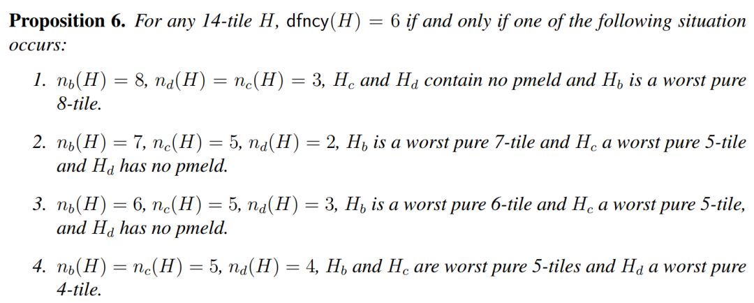 定义牌面的组合后,我们需要一种度量方法以确定到底当前 14 张牌离胡牌还有多远,这里作者引入了缺牌数(deficiency)。简单而言,缺牌数表示的就是当前牌面到胡牌还差多少张牌。