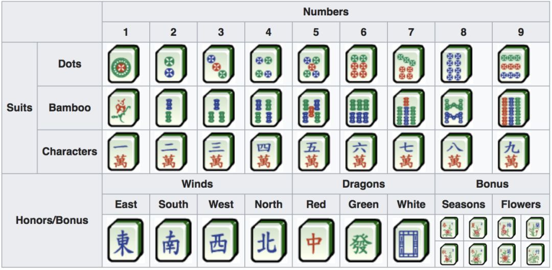 在此论文中,为了简化问题,我们只考虑麻将最基础的打法 Mahjong-0。其他的打法可以用类推的方式处理。在 Mahjong-0 打法中,只有三类牌:
