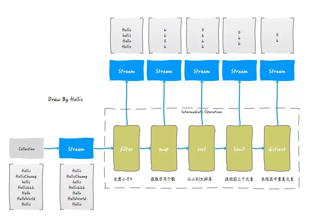 //3,2,7,5接下来我们通过一个例子和一张图,来演示下,当一个Stream先后通过filter、map、sort、limit以及distinct处理后会发生什么。