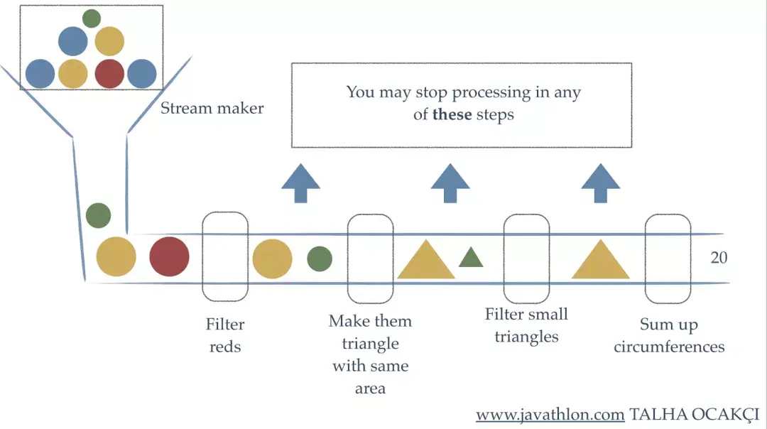 Stream有很多中间操作,多个中间操作可以连接起来形成一个流水线,每一个中间操作就像流水线上的一个工人,每人工人都可以对流进行加工,加工后得到的结果还是一个流。