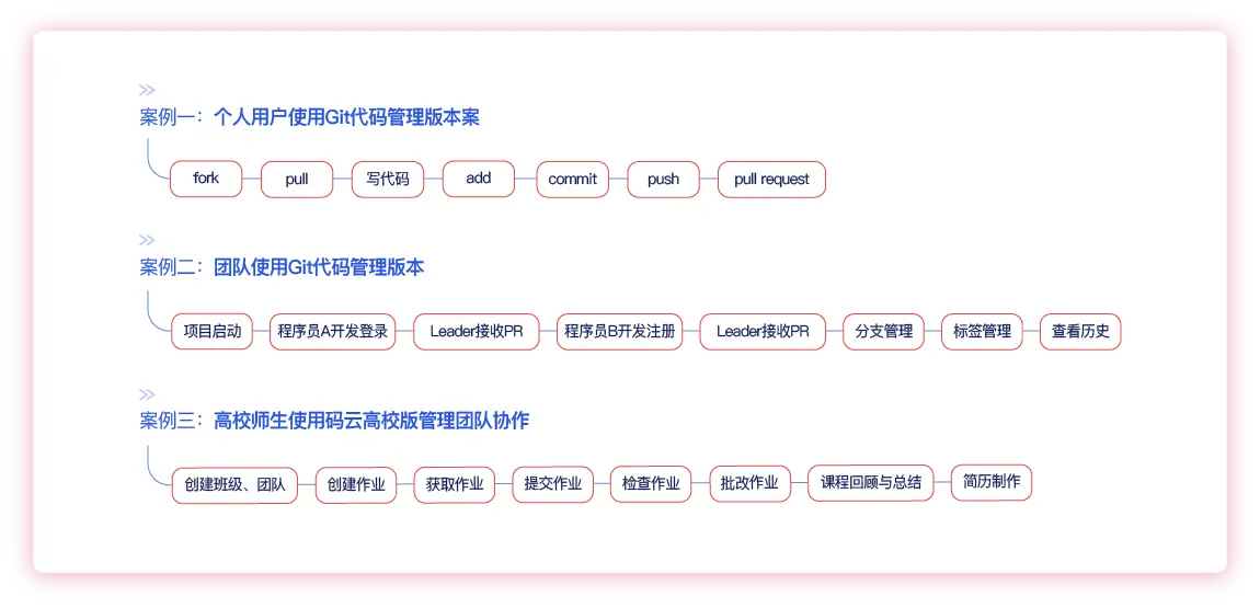 码云联合实训邦推出了《码云高校版实训教程》助力计算机/软件工程专业教学改革和软件工程实践落地。此课程以团队协作为故事背景,由3个案例故事带学生逐步学习 Git 基本命令,使学生能独立使用 Git 管理个人文件版本;能团队协作使用 Git 合作开发;能有效管理团队成员,作业与任务,计划与监控等。