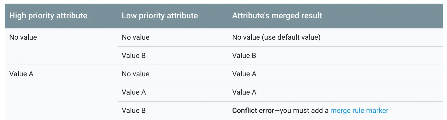 当这些属性在低优先级清单中的情况与 在高优先级 清单中的不完全匹配时生成构建故障。 这是所有属性的默认行为,具有 合并冲突启发式算法中介绍的特殊行为的属性除外。