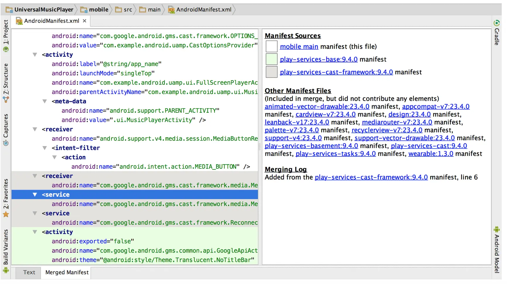<intent-filter>元素。 每个元素都被视为唯一元素,并添加至合并清单中的常用父元素。