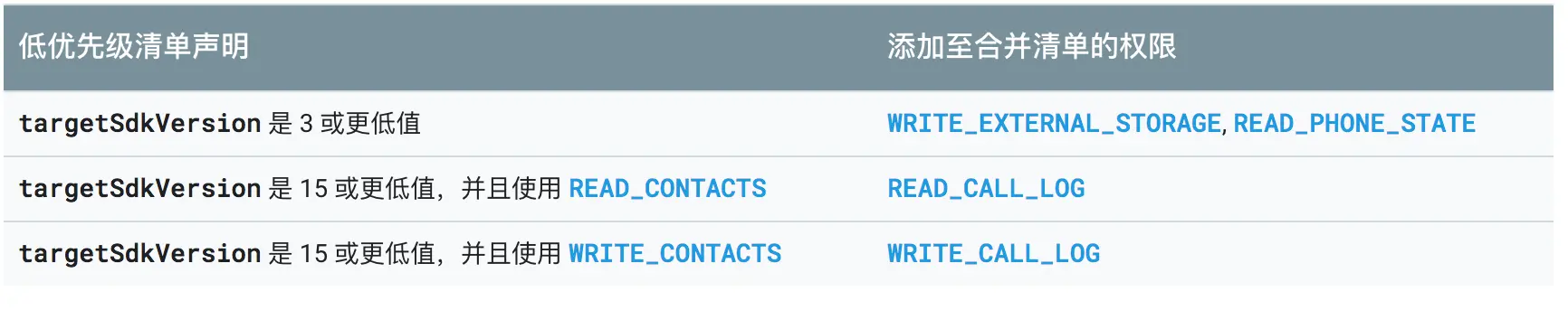 如果低优先级清单文件提供隐式权限的 targetSdkVersion 值较低,而且高优先级清单没有相同的隐式权限(由于其 targetSdkVersion 等于或高于添加限制的版本),合并工具将向合并清单显式添加系统权限。