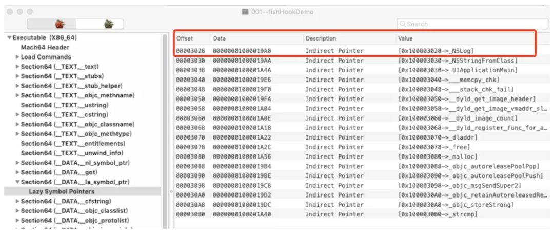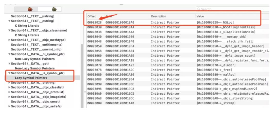 记下 0x3028 这个偏移值,这就是用于重定向到共享库中的那个指针相对于 MachO文件的偏移量。